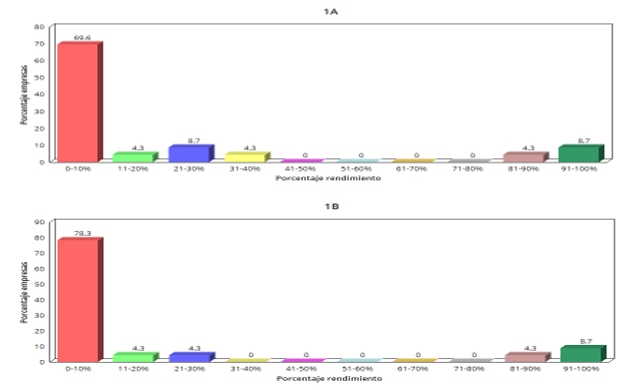 Se establece un comparativo porcentual del rendimiento de las empresas antes y después del confinamiento. De ellas, el 69,6% para producción y el 78,3% para ventas, se ubican en el rango más bajo de eficiencia (0% a 10%); si se amplía el rango, el escenario continua siendo muy similar; el 86,9% de las MiPymes mantiene un nivel de producción que no supera el 40%, en tanto que el mismo porcentaje, no supera el 30% de ventas que se registraban antes de la pandemia y tan solo el 13,1% se encuentra por encima de ese índice (ver gráfica 1A y 1B). Lo anterior indica que la gran mayoría de empresas presentaron una reducción significativa en su producción y ventas, lo cual hace necesario buscar medidas adicionales a las estipuladas por el Gobierno Nacional que les facilite salir de la crisis y evitar posibles liquidaciones o cierres temporales.