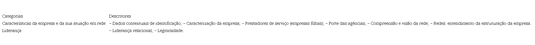 Ademais, a noção de liderança relacional apresenta-se oportuna como marco teórico do estudo ao reconhecer e ter por base a complexa interação existente entre distintos agentes sociais, organizacionais e individuais (Nunes, 2010). Já como marco teórico de rede, a opção foi pela abordagem de Fleury e Fleury (2003), os quais a compreendem como estruturadas e sustentadas por competências organizacionais e individuais que, por sua vez, influenciam diretamente as estratégias competitivas da organização, gerando, ou não, vantagem competitiva, bem como distintos impactos societais. Foi considerada também a perspectiva teórica de Knorringa e Meyer-Stamer (1999), que possibilitou caracterizar a rede objeto desta investigação como formal, embasada na dimensão contratual existente entre as partes, nos mesmos moldes de uma franquia, porém seguindo os preceitos de agenciamento usualmente utilizados pelo mercado de transportes.