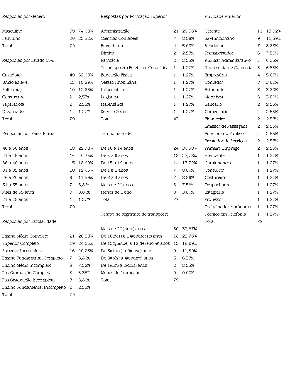 Isso, em um contexto em que mais de 90% dos membros da rede apontam não possuir experiência em gestão, em particular, na gestão de seus elementos humanos e/ou de atuar como líderes. Ou, ainda, revelam ser oriundos da própria empresa mãe: muitos deles antigos motoristas que trabalhavam com frete tipo carreto ou mudanças. Confessam, assim, na transição de empregados para “empreendedores”, a não superação de lacunas no desenvolvimento de competências relacionadas, além da gestão de pessoas, à gestão administrativo-financeira do empreendimento, agora sob sua responsabilidade. A Tabela 2 permite visualizar um panorama do perfil dos empreendedores das empresas filhas participantes da rede: