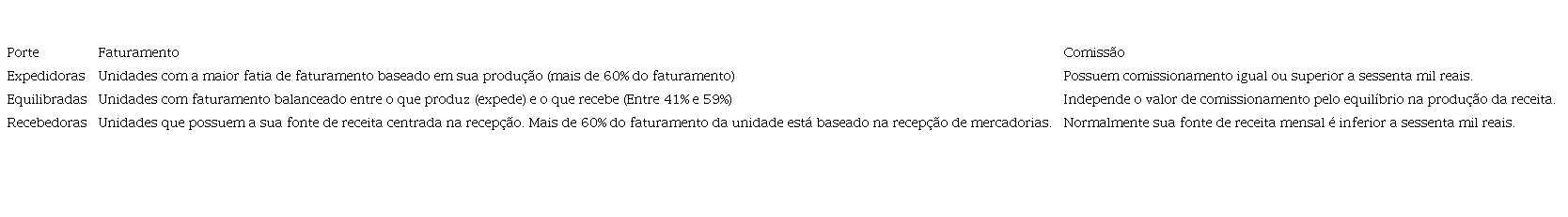 Por ser o pagamento aos empreendedores da rede realizado com base no volume e na quantidade de serviço realizado (faturamento da unidade), com pesos diferenciados de remuneração por distância do frete vendido e por expedição e recepção das mercadorias, realizou-se, para esta pesquisa, uma análise e subdivisão das empresas filhas, conforme consta na Tabela 3: