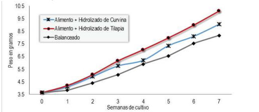 En los crecimientos finales y semanales, los camarones alimentados con el hidroliza do de tilapia presentaron mayor ganancia de peso, seguido por los alimentados con el hidrolizado de curvina, estas diferencias se debe a la cantidad de aminoácidos libres y disponibles en los hidrolizados de los pescados (Cuadro 2) sugerido por Izquierdo, Torres, Allara, Márquez, & Barbosa (2001), sobresaliendo el tejido de la tilapia con mayor cantidad de proteína y mayor cantidad de aminoácidos totales.