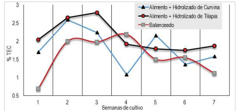 La TEC indica el grado de crecimiento diario de los camarones expresados en porcentaje, los animales alimentados con el extracto hidrolizado de tilapia presentaron TEC entre 2.79 y 1.87% en promedio por semana, 2.5 y 1.3% en los camarones alimentados con el extracto hidrolizado de curvina, y entre 2.11 y 0.69% en los animales alimentados con la dieta balanceada respectivamente.