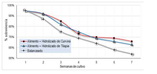 La sobrevivencia final fue de 71% para los camarones alimentados de con el extracto hidrolizado de curvina, seguido por los animales tratados con el extracto hidrolizado de tilapia con 68%, y 52% para los camarones alimentos únicamente con el balanceado. Estadísticamente no se encontraron resultados concluyentes entre la sobrevivencia final de los camarones alimentados con los hidrolizados de pescado.