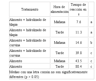 Se observaron diferencias altamente concluyentes entre los tres tratamientos (P<0.0001) encontrando el menor tiempo de captura e ingesta del alimento en la ración tratada con el extracto hidrolizado de tilapia con 9.5 segundos, seguido por el extracto hidrolizado de la curvina con 26.7 segundos y con 61.8 segundos el alimento balanceado. La mayor atractabilidad se observó en horas de la mañana (P<0.0001) encontrando el menor tiempo de captura en las raciones tratadas con el extracto hidrolizado de tilapia (Cuadro 1).