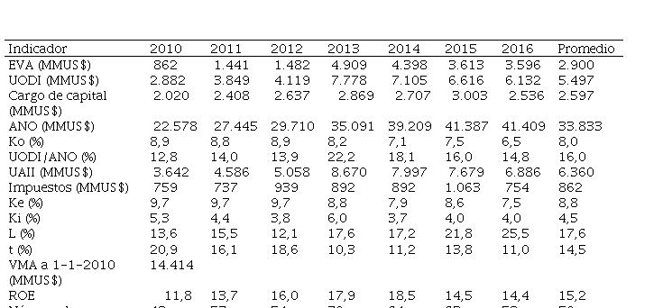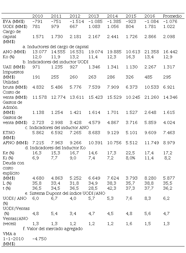 Al evaluar el porcentaje de utilidad o pérdida residual se observa que la relación UODI/ANO fue inferior a Ko en los siete años, lo que explica el por qué esta industria destruye valor en cada año. El indicador UODI/ANO ha variado en todo el septenio, siguiendo la misma tendencia de uno de los dos factores explicativos: el índice UODI/Ventas; el otro factor: Ventas/ANO, permanece casi constante en los primeros cinco años y solo obtiene una variación importante en el 2015 (Tabla 7, parte e).