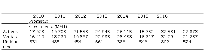 Se observa un crecimiento continuo de los activos y ventas, con una caída en el 2015, y altibajos en la utilidad neta (Tabla 3).
