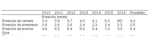 La rotación de cartera (4,0 veces), de inventario (2,5 veces) y la rotación de activos fijos (0,6 veces) presentan comportamientos diferentes: el primero después de oscilar, tiende a aumentar a partir del 2013; el segundo desciende a lo largo del período, con un ligero ascenso en el 2015; mientras el tercero varía su orientación en el septenio. Estos comportamientos contrastan con la rotación de activos totales (0,9) que permanece casi constante (Tabla 4). Una alta rotación de activos fijos que supera la cartera y los inventarios insinúa una menor eficiencia en la gestión de los activos corrientes.