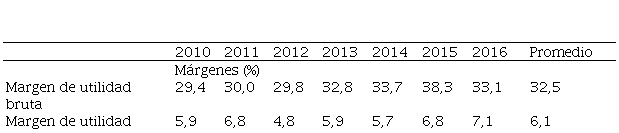 En la Tabla 5 se puede observar que los márgenes promedio de utilidad bruta (32,5 %), de utilidad operacional (6,1 %) y de utilidad neta (2,5 %) fluctuaron durante los siete años, con una mayor estabilidad en el primero que presenta un crecimiento entre 2013-2015, seguida del segundo que incrementa entre 2015-2016. Estas variaciones demuestran correlaciones positivas en la mayor parte del septenio. Las diferencias de los márgenes señalan que los costos de ventas (67,5 %) y los gastos de administración y ventas (26,4 %), en su orden, son las dos erogaciones que más influyen en la gestión eficaz de este sector.