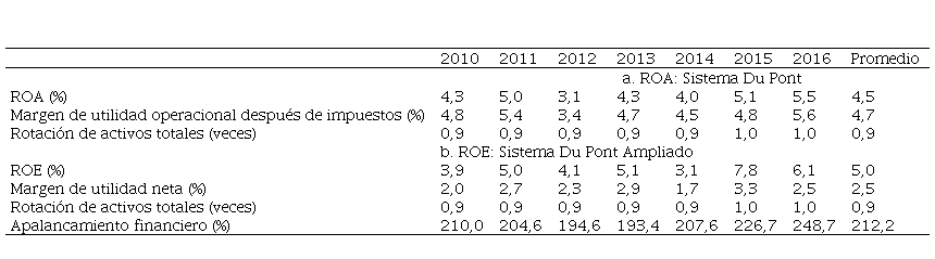 El margen de utilidad neta es positiva en cinco de los siete años estudiados, dejando un promedio en el período de 1,87 %; su comportamiento es similar a la utilidad neta, presentando su nivel más alto en el 2016 (3,7 %) y el más bajo en el 2013 (- 0,6 %). La eficacia en la gestión de costos y gastos se reduce de manera continua hasta la mitad del septenio (2013), posterior a este año se recuperó de manera gradual. Ver Tabla 1, parte c.