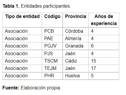 Para la selección de los sujetos se ha tenido en cuenta la trayectoria de los informantes en el cargo y función. En este sentido, han sido incluidos aquellos informantes que llevan en el cargo >4 años. Los participantes pertenecen a entidades que desarrollan su actividad en Andalucía. En la siguiente tabla (tabla 1) pueden verse algunos datos básicos de las entrevistas realizadas y la codificación asignada por las investigadoras.