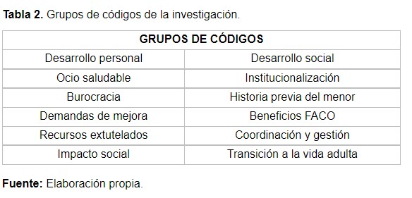 Tabla 2. Grupos de códigos de la investigación.