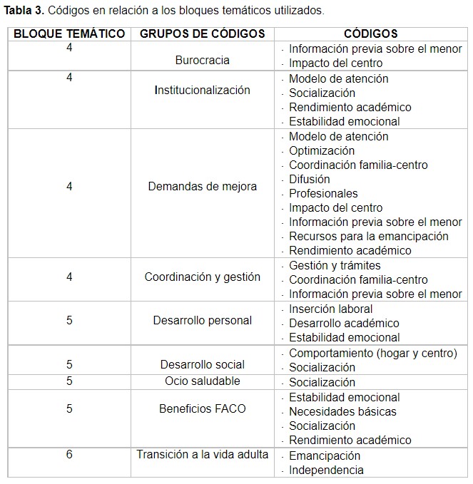 Tabla 3. Códigos en relación a los bloques temáticos utilizados.