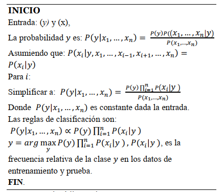 Para este caso de estudio se utilizó el clasificador Naive Bayes, entre sus ventajas se destacan: la rapidez y su capacidad de estimar con distribuciones unidimensionales. La figura 2, presenta su aplicación al conjunto de datos, en el cual y es una variable de clase o categórica y x es un vector dependiente (patrón o característica) donde x1 hasta xn. Por lo anterior, en la variable y, a cada valor considerado óptimo se le asigna un 0 y a cada temperatura fuera del rango normal se le asigna un dígito 1 para realizar la clasificación [16]. Este algoritmo se emplea en procesos secuenciales de mantenimiento de un modelo probabilístico dentro de un estado que con el tiempo va evolucionando, mientras es monitorizado por sensores. Una de las ventajas de este método es su formulación, ya que permite su aplicación en una variedad de problemas de fusión de datos sin modificar su representación o recurrir a otros modelos de observación [14].