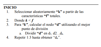 Este clasificador es considerado, además, como unmétodo estadístico no paramétrico que permite abordarlos problemas de regresión y clasificación de dos o másclases. Las recientes investigaciones de Scornet, E., et al.,[19] referenciadas a su vez por Genuer, R., et al., [17] demuestran la coherencia del método y sus parámetros derendimiento. Breiman, L. [20] define Random Forest dela siguiente manera: “…un bosque aleatorio es unclasificador que consiste en una colección declasificadores estructurados en árbol {h(x,.., Θk), k=1,…} donde {Θk} son vectores aleatoriosindependientes, distribuidos de forma idéntica y cadaárbol arroja un voto unitario para la clase más popular dela entra x…”.