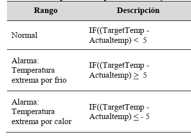 Para el preprocesado de los datos se estableció unrango para las temperaturas normales y dos tipos dealarma que indican las temperaturas extremas y por lo tanto, una posible falla en los equipos. En la tabla 3 sedescriben los valores normales y las alarmas.