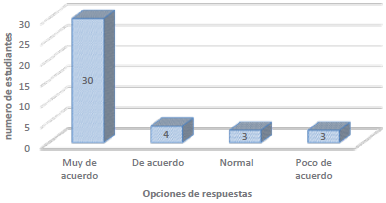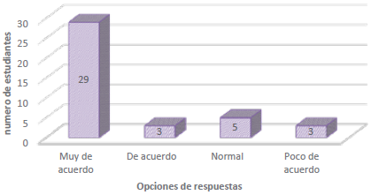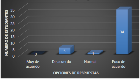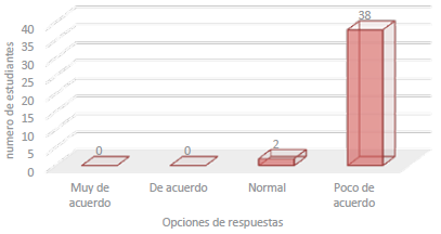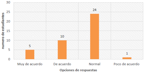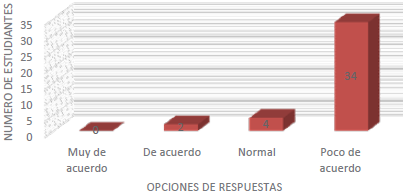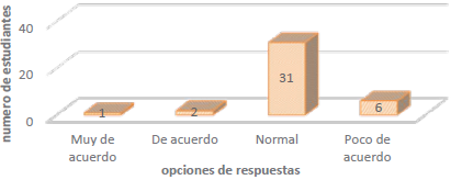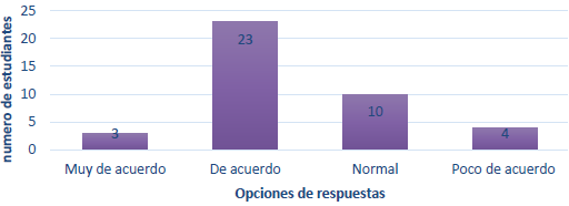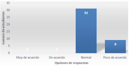 El gráfico marca una tendencia, con alto porcentaje entre normal 60% y con 4% en poco de acuerdo, lo que queda claro que los chicos no ven como novedoso la evaluación a lo tradicional, de manera escrita solamente, quedando al descubierto que hay posibilidades más interesantes para los chicos, donde pueden medirse en sus conocimientos, siendo entonces una estrategia que debe ser analizada en el seno del plantel educativo, pues según lo expuesto en este resultado queda evidente la poca aprobación de parte de los estudiantes de esta tradicional manera de evaluar.