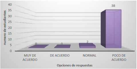 El gráfico muestra de manera contundente que el 75% de los encuestados responden muy de acuerdo, sumándole un 10% más que están de acuerdo, da como resultado un 85%, del grupo de encuestados consideran que las tácticas que han usado los docentes durante su tiempo de estudio, no satisface y tampoco cumple con los requerimientos y exigencia de los estudiantes. En el mismo resultado encontramos que el 15% de los encuestados, le parece normal y está poco de acuerdo, a lo mejor ya se acostumbraron a este tipo de estrategia, por el tiempo que llevan familiarizándose desde preescolar a grado 10, o simplemente no se les ha motivado a querer preparase de mejor manera para enfrentar su futuro.