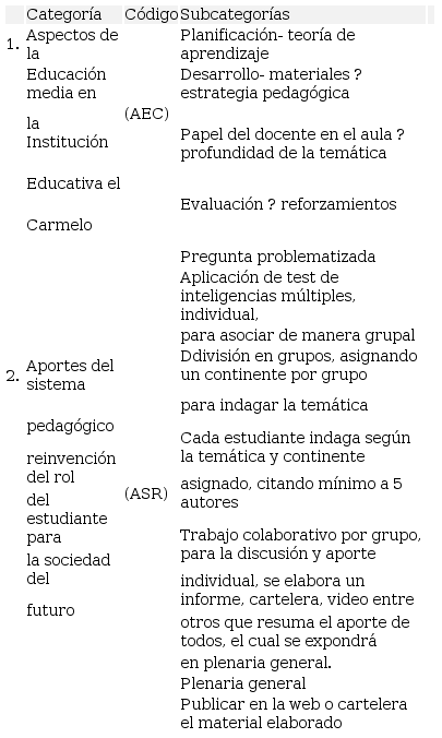 Observación directa se puede realizar participando en la experiencia vivida por el investigador apuntando su objetivo, a ?estar dentro? de la sociedad estudiada ( Guber, 2001). En el caso de la investigación ?un sistema para la reinvención del rol del estudiante para la sociedad del futuro?, se tuvo en cuenta los siguientes criterios donde se observaron dos categorías consignado en la tabla 4.1.3.2, los primeros aspectos de la educación media en la institución educativa el Carmelo y la segunda aportes del sistema pedagógico reinvención del rol del estudiante.