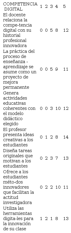 ( Cacheiro, Medina, Domínguez 2019; Domínguez, Leví, Ramos, Sánchez, 2013). han evidenciado que la plataforma y su principal instrumento de comunicación: el foro, promueve una activa colaboración entre docente y discentes, a la vez que demanda una intensa actividad ante las necesidades de un mundo globalizado, y de encuentro entre culturas, también afirman que los instrumentos aplicados nos permiten evaluar la percepción de los estudiantes encuestados, con respecto a la competencia digital. Para el presente estudio se requirió los siguientes materiales: filmadora, laboratorio, computadora, software aulas, libreta de apuntes, bolígrafo; se realizó una tabla en Excel donde se clasificó los datos de cada estudiante evaluado, colocando el resultado sobre la encuesta de la competencia en estudio. La competencia digital en la función docente se concreta en una guía didáctica innovadora y el plan de formación que cada docente ha de reelaborar, precisar y trabajar con la mayor autonomía, mediante la incorporación de recursos como la plataforma.