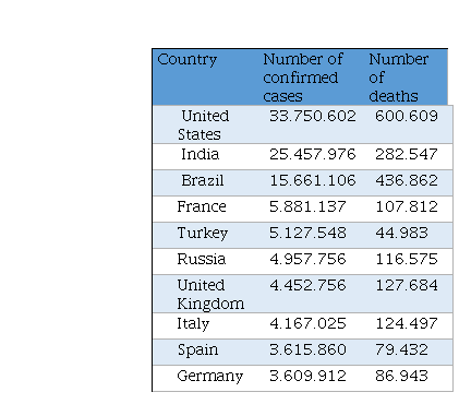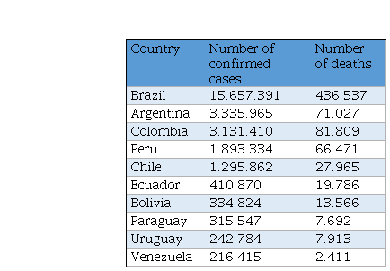There is currently growing concern about the exponential increase of infections caused by COVID 19 in the world, which led the WHO to declare a pandemic state on March 11, 2020, due to the virus originating in Wuhan - China. The result is an unprecedented health, economic and social crisis, which has exposed and intensified the inequality gap and increased poverty in regions such as Latin America. It is estimated that 25 million people will be in poverty due to increased unemployment and underemployment. This panorama shows the dichotomy between economy and health, for which the states declare a state of emergency. According to WHO, the world has registered 164,622,686 confirmed cases of SARS-CoV-2 coronavirus infection and 3,411,089 deaths to date (17/05/2021).
