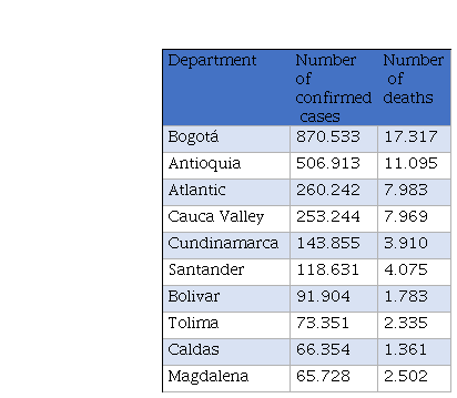 In Colombia there are 3,131,410 confirmed cases and 81,809 deaths due to COVID-19, the 10 most affected regions are: