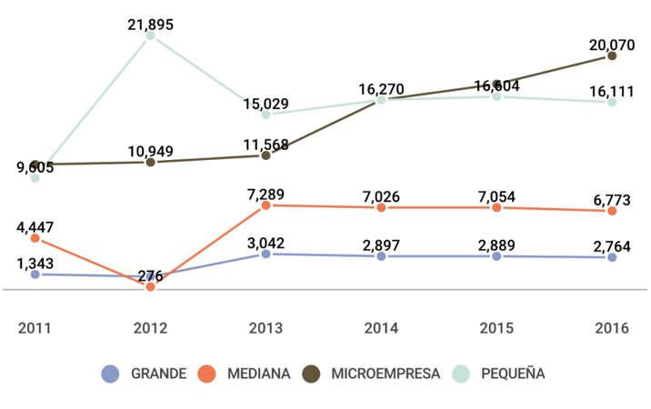 Tal como se puede apreciar en el Gráfico 2, en el Ecuador las cantidades de todos los tipos de empresas han experimentado variaciones a lo largo de los años. En el 2012 la presencia de las empresas pequeñas tuvo un aumento significativo con respecto al 2011, ya que aumentó de 9 mil a 21 mil empresas. Esta situación pudo darse por una expansión en las microempresas que se transformaron en pequeñas empresas. Sin embargo, las medianas empresas en el mismo año tuvieron una disminución notoria de 4,447 empresas a tan solo 276. Esto pudo ocurrir debido a que no todas las empresas reportaron ingresos o cantidad de empleados para clasificarlas de acuerdo a su tamaño en este período. Las microempresas son las únicas que muestran una tendencia incremental en todos los años, dado que en el Ecuador es el tipo de empresa que necesita de menos requisitos para constituirse y menos inversión inicial. Además, en Ecuador ha sido notorio el mercado el aumento de emprendimientos de distintas líneas de negocios. Las empresas grandes son las que muestran más estabilidad en cuanto a la cantidad de las mismas que existe en Ecuador. Esto pudo ser porque la mayoría pertenecen a grupos económicos consolidados son más estructuradas y logran mantenerse a lo largo del tiempo. Algunos ejemplos son Corporación La Favorita que pertenece al Grupo Wright y Corporación el Rosado al Grupo Czarninski. A partir del año 2014 hasta el 2016 todas las empresas no presentaron cambios drásticos con respecto a sus cantidades en el mercado.