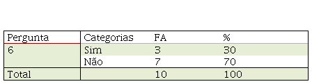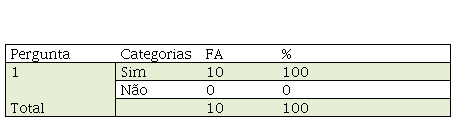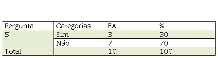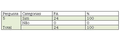 A pergunta número cinco (5) que explorava se os estudantes reconhecem que as disciplinas que recebem no primeiro ano lhes oferecem ferramentas para o seu futuro como profissionais, as respostas dos mesmos são unânimes, tal como se pode observar na tabela abaixo. Este resultado revela que os estudantes recebem das disciplinas ferramentas propícias para se obter resultados satisfatórios no curso de Matemática.