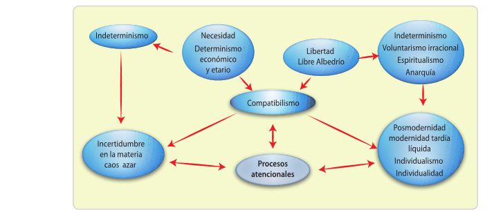 En segundo momento, existen acontecimientos diversos entre los determinismos y las libertades fluyendo en el sistema educativo, que moviliza la intencionalidad y decisión de los profesores motivándolos a crear rutas coherentes, incongruentes, erráticas y estacionarias, entre las tres posturas. En el individuo está la posibilidad de intervenir en una tendencia determinista durante un tiempo determinado y variar a la tendencia compatibilista en otro tiempo o asegurar un tiempo de libertad frágil.