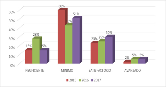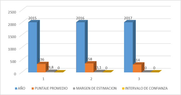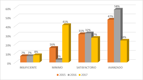 En los resultados de la Figura 2, estadísticamente, las diferencias no tienen mayor relevancia entre el promedio de los años 2015, 2016 y 2017 pero, es necesario observar que la desviación estándar (DE) es 67; esto quiere decir que, aproximadamente, el 68 % de los estudiantes obtuvieron resultados entre 233. El mayor porcentaje de preguntas de la prueba se enfocó en el componente semántico. En contraste, las pruebas institucionales buscaron evaluar el nivel de comprensión que alcanzaron los estudiantes en cuanto a los conceptos fundamentales trabajados en las dimensiones, pensamientos o áreas, para lo cual se valoró la capacidad de análisis e interpretación para resolver una situación problemática dentro de un contexto real y las estrategias conceptuales que utilizaron para darle solución.