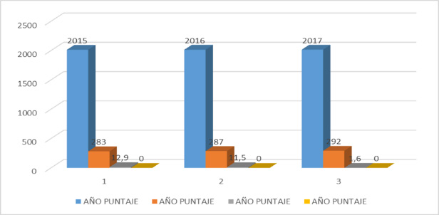 La Figura 3 permite evidenciar que, estadísticamente, las diferencias son significativas entre el puntaje promedio en 2017 y su puntaje promedio en 2016. De igual manera, el puntaje promedio en 2017 es inferior a su puntaje promedio en 2016. No existen diferencias significativas entre el puntaje de 2017 y el puntaje promedio en 2015 en la IE CDR.