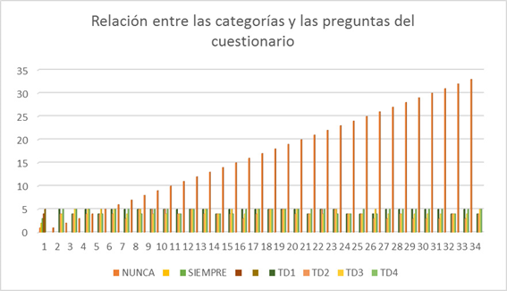 Respecto a la descripción de la codificación axial de las 33 preguntas del cuestionario mixto aplicado a los 13 profesores de básica primaria que decidieron participar de manera voluntaria en la investigación, es bueno aclarar que las preguntas tenían una escala valorativa de 1 a 5 y los docentes, de acuerdo a esas escalas, podían señalar la que mejor se acercara a su desempeño, o según el grado de importancia que le concedieran a cada una de las cinco opciones de respuesta, dejando la opción de enunciar otro aspecto que consideraran significativo para responder a la pregunta.