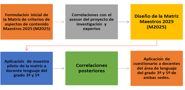 En la Figura 6 se describió e interpretó los pasos que los docentes deben realizar en la reconstrucción de su práctica pedagógica, teniendo presente la estrategia de la matriz de criterios de los aspectos de contenido de Maestro 2025 (M2025), la cual se ejecutó en varios pasos: aplicación de la encuesta de indagación acerca del desarrollo de su quehacer pedagógico; aprendizajes abordados en clases; interpretación que hacen de los referentes de calidad; la manera como ellos comprenden y asumen la herramienta, la cual pretende divisar el posible uso pedagógico para cumplir con la meta expuesta por el MEN (2015) en cuanto a que, el país sea el más educado en el año 2025.