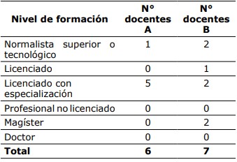 La Tabla 1 mostró la caracterización de la unidad de análisis, conformada por trece docentes pertenecientes a los dos IE, indicando que en la IE A, hay cinco docentes con estudios en especializaciones afines en el área de desempeño y un solo docente normalista superior. En la IE B, el máximo estudio realizado llega a dos docentes con estudios en maestrías y dos con estudios en especializaciones afines a su área de desempeño. Además, en esta misma institución hay dos docentes que son normalistas, en edades entre los 35 y los 42 años, lo que quiere decir que no han adelantado estudios que tengan relación directa con la didáctica y la pedagogía, hecho que se verá reflejado en los procesos de enseñanza y aprendizaje.