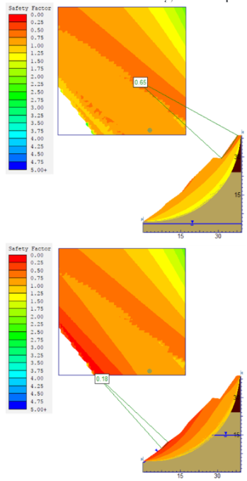 El Perfil 1 mostró que el área de deslizamiento posee un factor de seguridad de 2 o menos para el talud con nivel freático inicial (izquierda) y calculado (derecha); la zona naranja con mayor intensidad en el talud inicial presentó un factor igual o menor a 1, por tal motivo este presentó una tendencia a fallar, sin embargo, con la modelación calculada el factor decrece considerablemente y la totalidad de la zona de falla se encuentra por debajo de 1 en términos de seguridad.