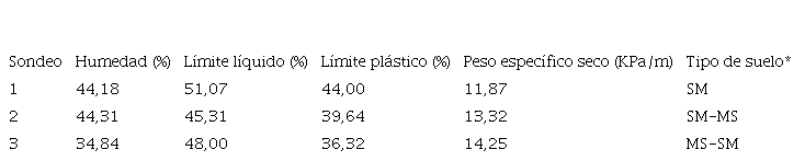 Una vez realizado los ensayos para los diferentes sondeos, se obtuvieron las siguientes características físicas y mecánicas del suelo (Tabla 2):