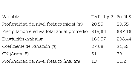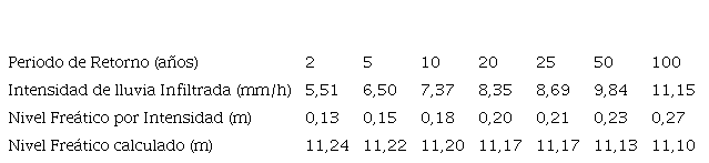Además, el estudio mostró que la variación del nivel freático en función del periodo de retorno es despreciable, ya que la profundidad inicial de la lámina de agua y el coeficiente de varianza de la precipitación efectiva total anual generan un nivel considerablemente mayor que el suministrado por la intensidad de la lluvia infiltrada diaria.