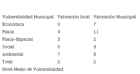 Según la valoración de cada uno de los aspectos se determinó el valor total, su promedio dio como resultado la valoración de la vulnerabilidad. En la Tabla 6, se muestra la recopilación del número de variables que se tienen en cuenta en cada caso y su respectiva calificación y clasificación final.