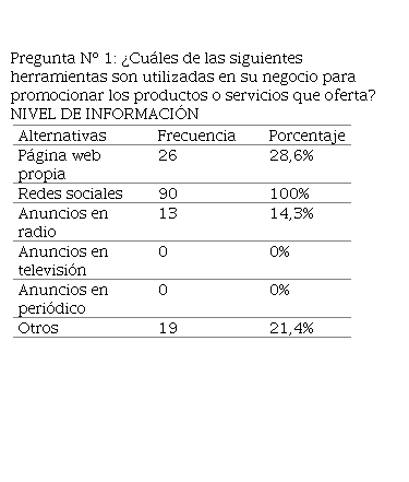 A pesar de disponer de algunas redes sociales en la actualidad se sigue notando el dominio de Facebook, Instagram y WhatsApp sobre todo en lo relacionado con tareas de marketing digital, también se ha visto que son muy pocas las microempresas que optan por disponer de una página web propia. De igual modo los medios tradicionales como la radio y televisión en este tipo de establecimientos son alternativas que no se consideran como parte de las estrategias de mercadeo de productos o servicios.