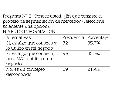 En esta pregunta se aprecia que un 42,9% personas encuestadas afirman que conocen el proceso de segmentación de mercado pero que no lo utilizan en su negocio. Además, se observa que el 21,4% desconocen del tema para poder promocionar a sus negocios.