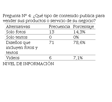 En esta pregunta se aprecia que un 78,6% de personas encuestadas utilizan los diseños que incluyen fotos y textos para promocionar y vender sus productos o servicio de su negocio y muy pocas personas utilizan solo el texto. Esto refleja que es indispensable que exista el material visual y entretenido para atraer a los clientes.