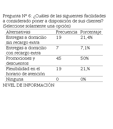 Es importante hacer notar que el número de microempresas que utilizan videos para promocionar sus servicios es mínimo por eso dentro de las redes sociales a las que se recurren no se aprecia el uso ni de Youtube ni de Tik Tok que en estos últimos años han ganado un número de usuarios considerable es más de acuerdo con (Alvarez, 2020) los videos dentro de plataformas como Tik Tok son visualizados por millones de usuarios entre los cuales el 40% tiene una edad que oscila entre los 16 y 24 años actualmente pero sin duda este público ira madurando por lo cual es conveniente considerar también este tipo de redes sociales que están consolidándose a la par de Facebook, Instagram y WhatsApp. De igual modo se ha podido determinar que todas las microempresas han implementado algún tipo de facilidad para mejorar sus ventas ya flexibilizar los horarios de atención, facilitar las entregas a domicilio o planificar promociones y descuentos.