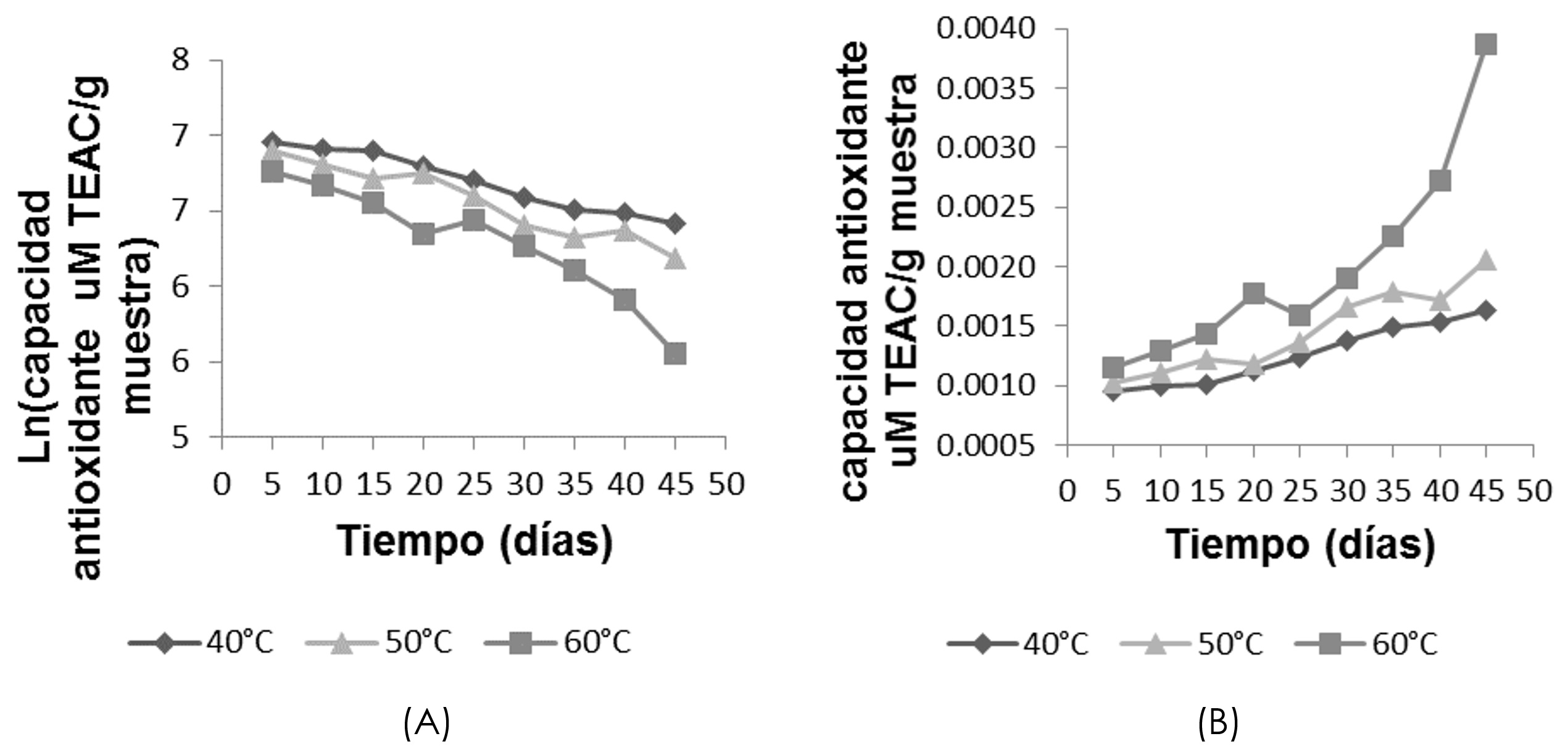 Se elaboraron gráficos de concentración de capacidad antioxidante vs tiempo en orden 0 (figura 4), logaritmo natural de concentración de capacidad antioxidante vs tiempo en orden 1 (figura 9A), 1/concentración de capacidad antioxidante vs tiempo en orden 2, (Figura 9B). El criterio para determinar el orden de reacción, que más se ajustó al modelo, fue por el coeficiente de correlación (R2).