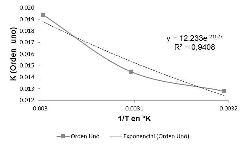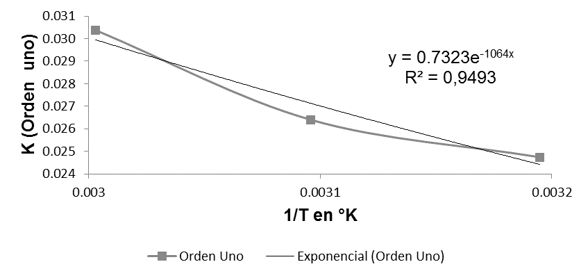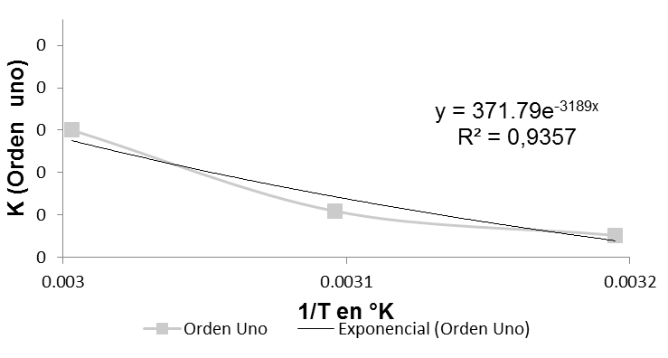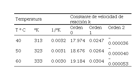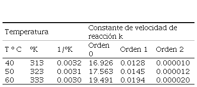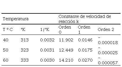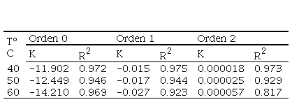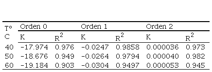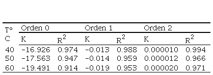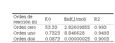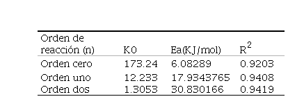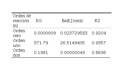 Las constantes de velocidad de reacción (K) de orden cero, uno y dos fueron acondicionadas para el ajuste del modelo de Arrhenius que se muestra en la tabla 2.