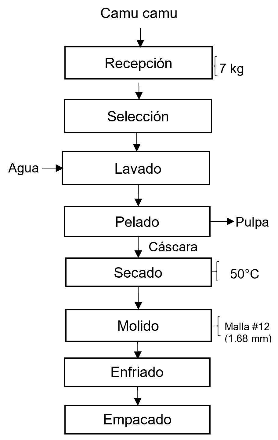 En esta investigación, se utilizaron 7 kg de camu camu. Los frutos con residuos extraños y con daño mecánico fueron separados, luego seleccionados los de mejor apariencia. Luego se lavaron las frutas en una bandeja con 10 L de agua para eliminar las partículas extrañas. Seguidamente, las frutas se pelaron de forma manual para la obtención de la cáscara y pulpa, la cáscara fue puesta en mallas metálicas de 20 x 25 cm de área para ser secadas en un secador de bandejas por aire caliente, a 50 °C, 2.5 m/s de velocidad de aire por aproximadamente 6 horas hasta peso constante (Garay y Villanueva, 2015). La cáscara seca de camu camu se trituró en una licuadora, se tamizó en un tamiz #12 con 1.68 mm de diámetro de la partícula. Las muestras molidas fueron enfriadas a temperatura ambiente y se empacó en bolsas de polipropileno de baja densidad con espesor 0,03 mm.