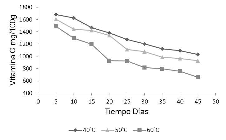 A días 45 de almacenamiento, se observó un descenso considerable de vitamina C, donde la mayor pérdida de vitamina C es a 60 °C con 36.08 % de vitamina C remanente y a 40, 50 °C son los que mejor se conservaron con 56.31 y 50.94 % de vitamina C remanente, respectivamente. De acuerdo con Castañeda et al. (2010), las pérdidas en vitamina C de la cáscara de camu camu pueden aducirse a que el ácido ascórbico es un componente muy sensible a la temperatura (calor) y oxidación.