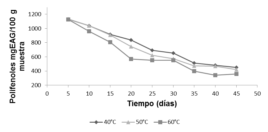 A los 20 días de almacenamiento, a 60 °C, se observó un mayor descenso de polifenoles (35.57 % de polifenoles remanente), con respecto a 40 y 50 °C (52.18 y 46.34 % de polifenoles remanente, respectivamente). Según Muñoz et al. (2015), se reportó que al incrementar la temperatura puede contribuir a la activación de enzimas que participan en la descomposición de los compuestos complejos que crean puentes de hidrógeno con los compuestos fenólicos.