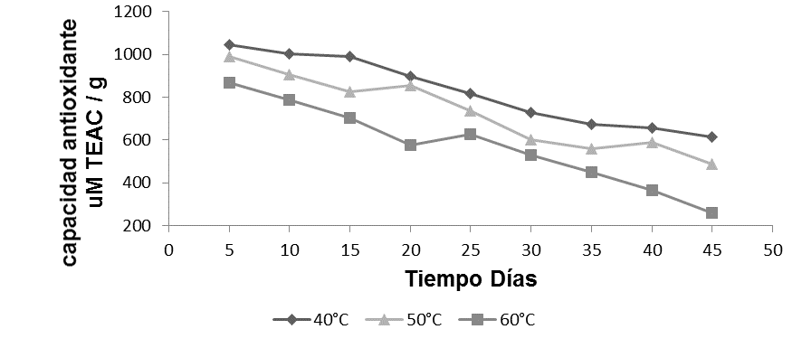 A los 45 días de almacenamiento se observó que hay variación entre las temperaturas de 40 °C con una capacidad antioxidante de 615.39 µM TEAC/g, y a 60 °C con 258.54 µM TEAC/g con una pérdida considerable de la capacidad antioxidante. Busso (2016) observó que cuando la capacidad antioxidante es sometida a bajas temperatura y a un tiempo de almacenamiento existe una relación directa en el descenso de los polifenoles.