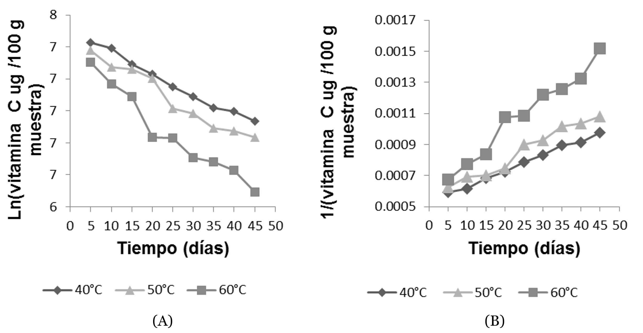 Para cada grupo de datos de concentraciones de vitamina C, se elaboraron gráficos que incluyeron la concentración de vitamina C frente a tiempo (orden 0) tal como se muestra en la figura 2. Otra figura de logaritmo natural de concentración de vitamina C frente a tiempo en orden 1 como se puede observar en las figuras 5A. Finalmente un gráfico de 1/concentración de vitamina C frente a tiempo en orden 2 como se muestra en la figura 5B. El criterio para determinar el orden de reacción fue el que más se ajustó al modelo, cuantificado por el coeficiente de correlación (R2). Gonzales et al. (2016) indicaron que el olor extraño, brillo, sabor característico, consistencia y jugosidad del camu camu, se ajustaron mejor a cinética de primer orden, mientras que el resto de atributos siguieron una cinética de orden cero.