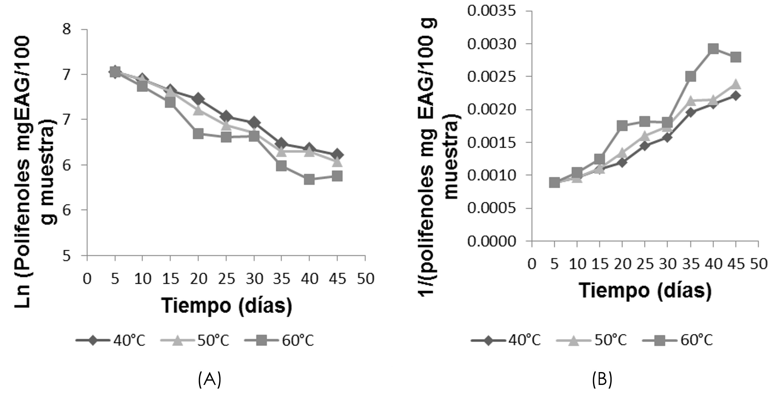 Para cada grupo de datos de concentración de polifenoles totales, se elaboraron gráficos, concentración de polifenoles totales vs tiempo en orden 0, (figura 3), logaritmo natural de concentración de polifenoles totales vs tiempo en orden 1 (figura 7A). Finalmente, 1/concentración de polifenoles totales vs tiempo en orden 2 como se muestra en la figura 7B. El criterio para determinar el orden de reacción fue el que más se ajustó al modelo, cuantificado por el coeficiente de correlación (R2).