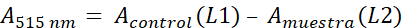 Donde: A es la absorbancia de vitamina C, L1 es la bsorbancia del colorante o control y L2 es la absorbancia de la muestra. El valor obtenido se remplaza en la ecuación dada por la curva estándar. Esta concentración se multiplica por el factor de dilución 1/40 y se obtuvo la concentración de la vitamina C en mg/mL